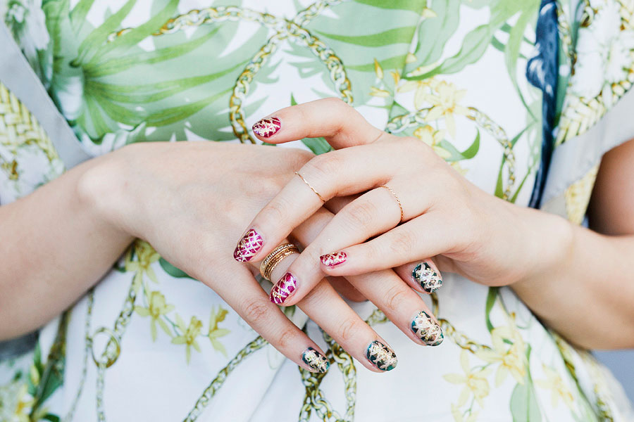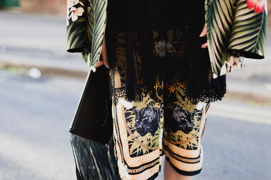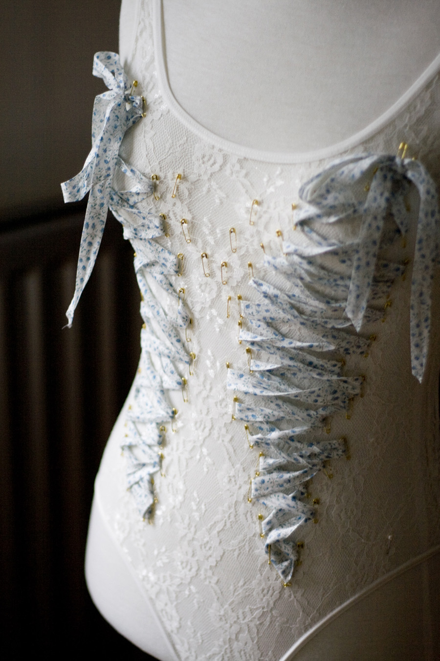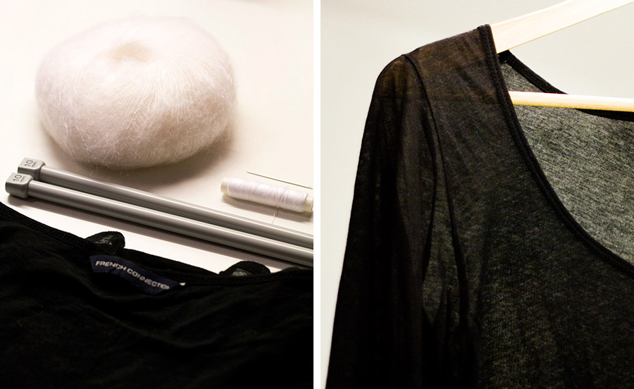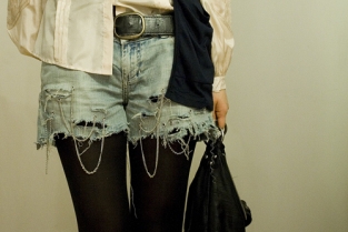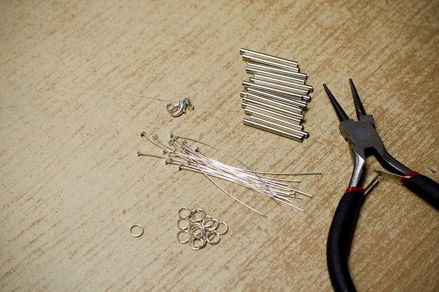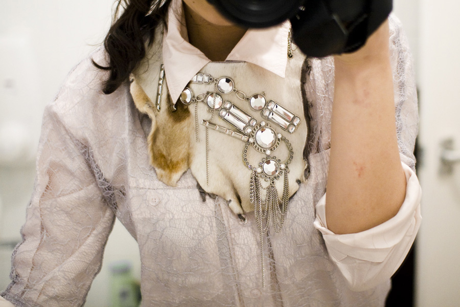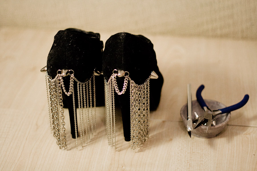 A piece of cowhide or any ‘expressive’ leather (you can find in fabric stores occasionally), cheap jewellery that you can break apart, chain + jumprings, Glue Gun